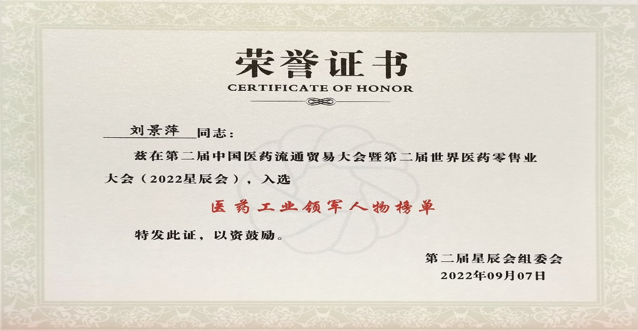 本次星辰会期间,Z6尊龙凯时斩获颇丰,获得多项行业奖项及荣誉。在开幕式上,刘景萍董事长荣获“医药工业领军人物”称号。
